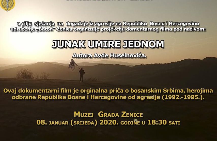 U cilju sjećanja na događaje iz agresije na Republiku Bosni i Hercegovinu Udruženje „Baton“ Zenica organizuje projekciju dokumentarnog filma pod nazivom: JUNAK UMIRE JEDNOM – Autora Avde Huseinovića. Ovaj dokumentarni film je orginalna priča o bosanskim Srbima, herojima odbrane...