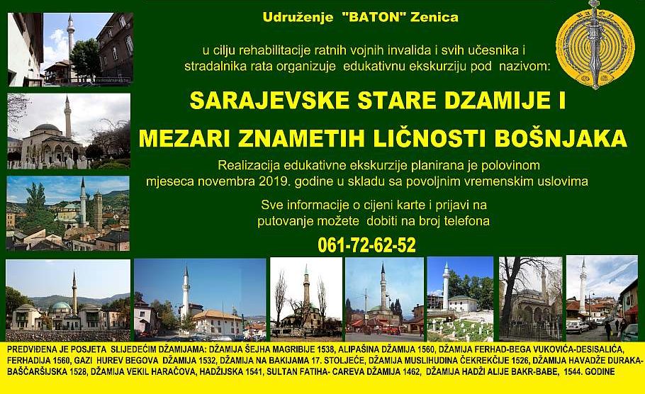 Udruženje “BATON” Zenica organizuje edukativnu ekskurziju – U cilju rehabilitacije ratnih vojnih invalida i svih učesnika i stradalnika rata Udruženje “BATON” Zenica organizuje edukativnu ekskurziju pod nazivom: SARAJEVSKE STARE DZAMIJE I MEZARI ZNAMETIH...