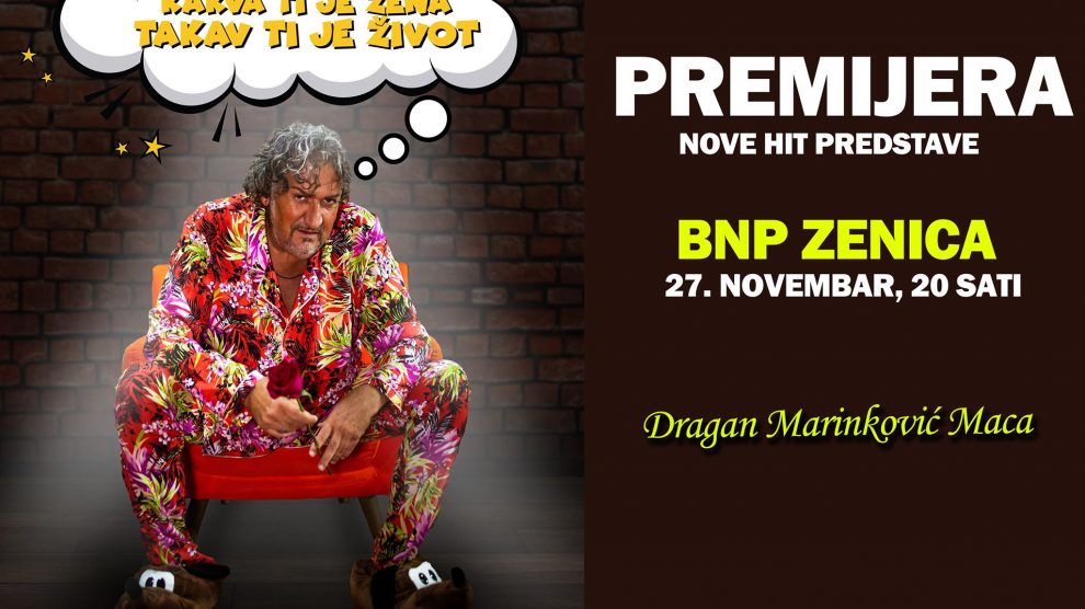 PREMIJERA NOVE PREDSTAVE DRAGANA MARINKOVIĆA MACE U ZENICI Dragan Marinković Maca će premijerno predstaviti svoju novu hit predstavu u Zenici. Predstava će se održati 27. novembra u Bosanskom narodnom pozorištu sa početkom u 21 sat. ‘’KAKVA TI JE ŽENA ,TAKAV TI JE ŽIVOT’’ je predstava ...