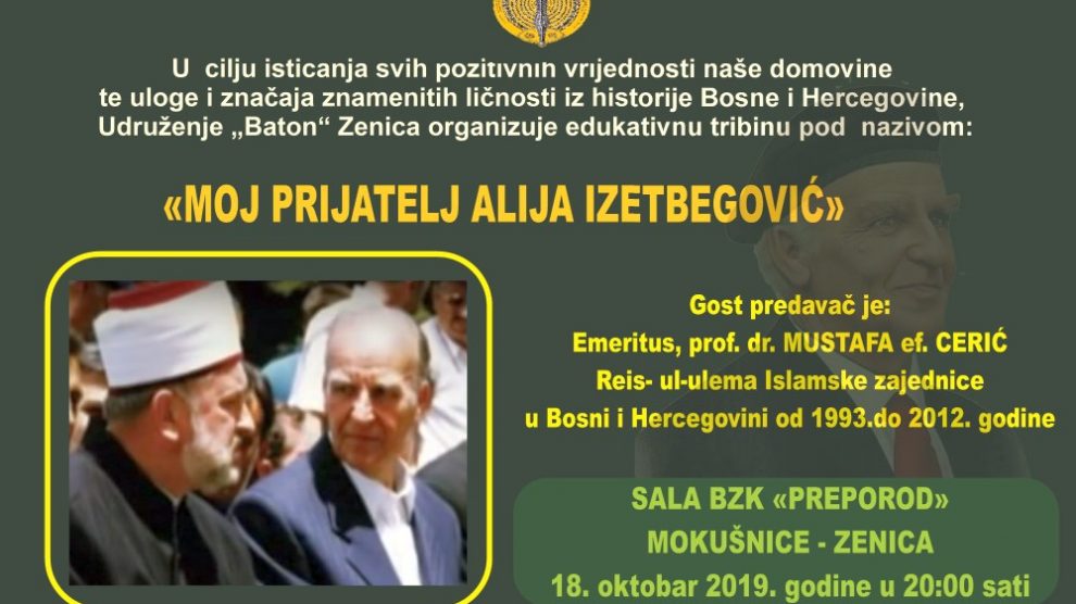 U cilju isticanja svih pozitivnih vrijednosti naše domovine te uloge i značaja znamenitih ličnosti iz historije Bosne i Hercegovine, Udruženje „Baton“ Zenica organizuje edukativnu tribinu pod nazivom: MOJ PRIJATELJ ALIJA IZETBEGOVIĆ Gost predavač je: Emeritus, prof. dr. MUSTAFA ef...