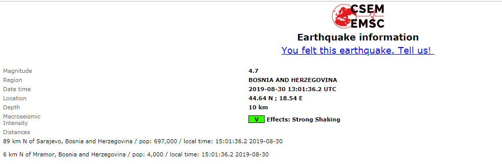 Jak zemljotres zabilježen u okolini Tuzle, osjetio se i u Zenici – Danas u 15:02 u okolini Tuzle osjetio se zemljotres jačine 4,6 stepeni Richterove skale. Epicentar je zabilježen šest kilometara sjeverno od Mramora na dubini od deset kilometara, prema Euromediteranski seizmološki...
