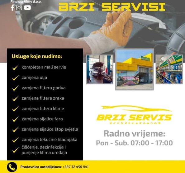Brzi servisi u sklopu beniznskih pumpi Almy – U sklopu beniznskih pumpi Almy u Zenici, nalaze se dva brza servisa koji su opremljeni najsavremenijom opremom. U našim servisima nudimo uslugu besplatnog kompletnog malog servisa za ulja i filtere kupljene u benzinskim pumpama Almy i u...