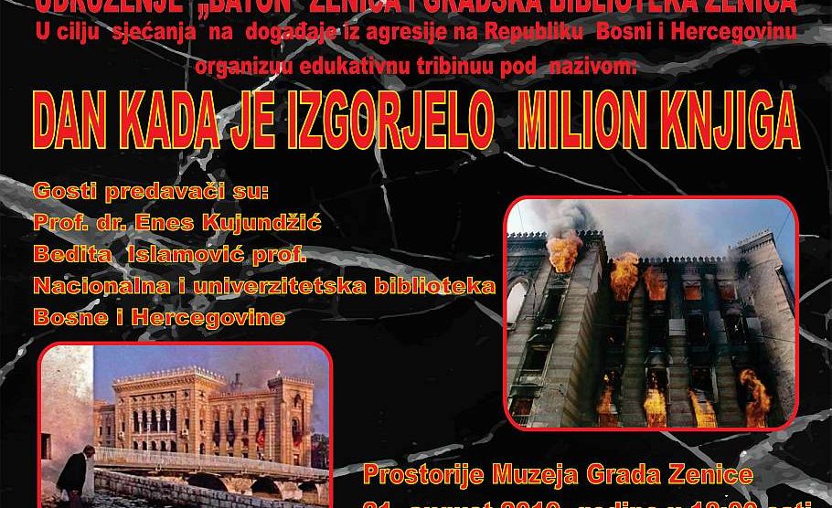 BATON Zenica: javna tribina -“Sarajevska vijećnica – Dan kad je izgorjelo milion knjiga” – U cilju sjećanja na događaje iz agresije na Republiku Bosni i Hercegovinu, 25/26. august 1992. dodine, dan kada je počinjen jedan od najvećih kulturocida u našoj...
