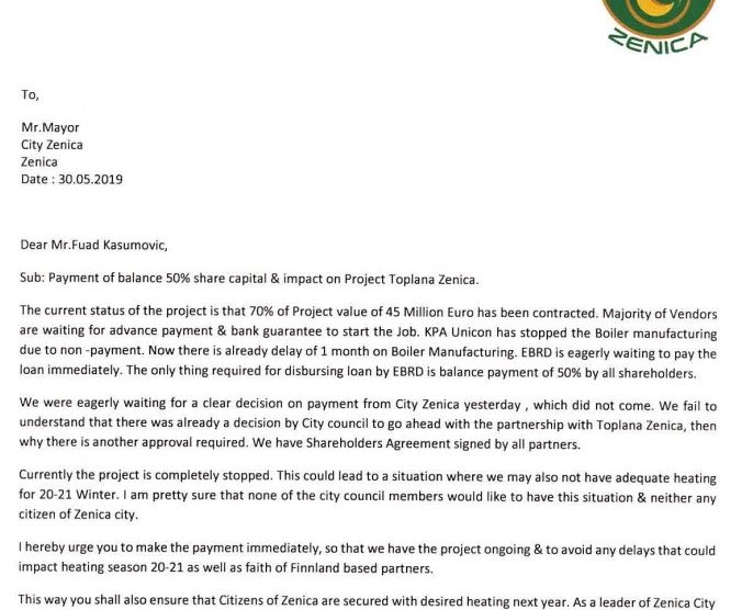 Saopćenje za javnost Gradske uprave Zenica – Dopis Toplana d.o.o. Zenica – Generalni direktor joint- venture kompanije “Toplana” d.o.o. Zenica, Nikhil Mehta uputio je u četvrtak, 30. maja 2019. godine dopis gradonačelniku Zenice, Fuadu Kasumoviću, s ciljem...