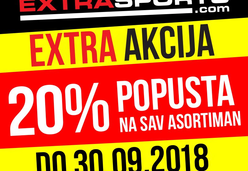 Extra Sports: extra akcija – 20% popusta na kompletan asortiman – U Extra Sports radnjama je do 30.09.2018. godine aktuelna Extra akcija. EXTRA AKCIJA Spremite se za ekstra šoping. Do 30.09. ne propustite ⚡20% popusta na kompletan asortiman⚡ sportske odjeće i...
