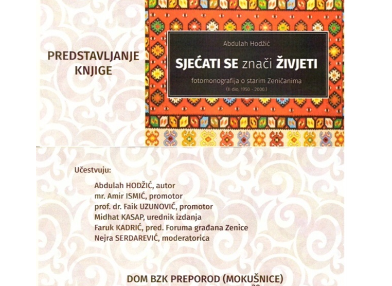 Promocija fotomonografije “Sjećati se, znači živjeti II” Abdulaha Hodžića – 19:30h utorak – U okviru izdavačke djelatnosti i u okviru aktivnosti Književnog kruga Bošnjačke zajednice kulture “Preporod” Zenica. organizujemo promociju fotomonografije “Sjećati se...