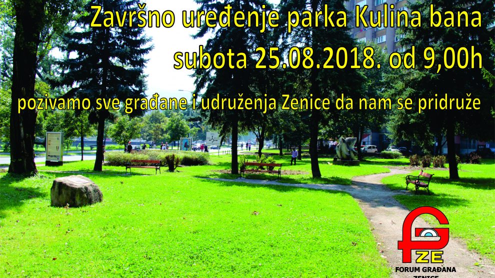 Forum građana Zenice: poziv na završnu akciju na uređenju budućeg Parka Kulina bana – Obaviještavamo vas da Forum građana Zenice organizuje završnu akciju na uređenju budućeg Parka Kulina bana. Akcija će se održati u subotu, 25.08.2018.godine sa početkom u 9,00 sati u parku kod...