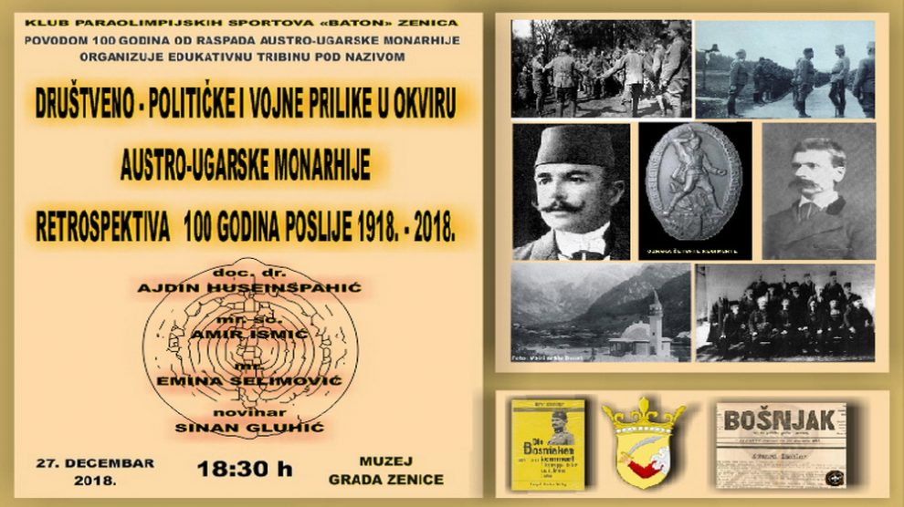 KPS “Baton” Zenica: Tribina “Društveno-političke i vojne prilike Bošnjaka u okviru Austro-Ugarske monarhije” – KLUB PARAOLIMPIJSKIH SPORTOVA „BATON“ ZENICA POVODOM 100 godina RASPADA AUSTRO-UGARSKE MONARHIJE ORGANIZUJE EDUKATIVNU TRIBINU POD NAZIVOM:...