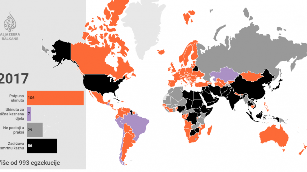 Mapa: Smrtna kazna legalna u 56 zemalja – Zemlje regije ukinule su smrtnu kaznu u periodu od 1989. do 2007. godine, navodi se u najnovijem izvještaju Amnesty Internationala. U evropskim zemljama ta praksa je ukinuta, izuzev Bjelorusije, gdje je prošle godine pogubljeno dvoje ljudi...