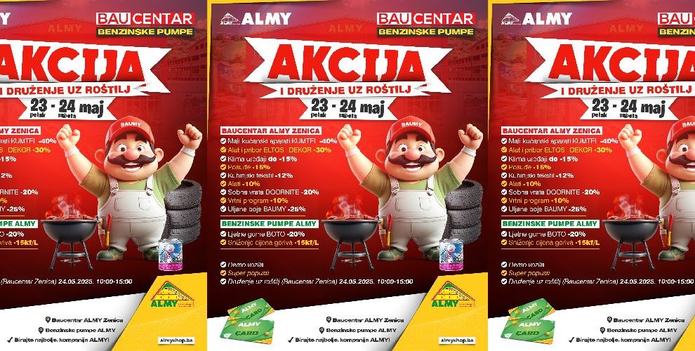 Almy: Akcija i druženje uz roštilj!- Baucentar ALMY Zenica ⛽️ Benzinske pumpe ALMY Zenica, Sarajevo i Zavidovići ⭕️ Super popusti i druženje uz roštilj ✅️ Dobro nam došli 23 i 24.05.2025. BAUCENTAR ALMY ZENICA ✅️ Mali kućanski aparati KUMTEL -40% ✅️ Alat i pribor ELTOS i DEKOR -30% ✅️...