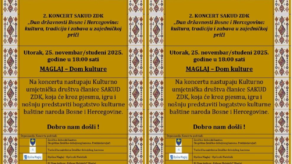 Savez kulturno-umjetničkih društava Zeničko-dobojskog kantona (SAKUD ZDK) organizira svečani koncert povodom 25. novembra/studenog – Dana državnosti Bosne i Hercegovine, koji će biti održan u utorak, 25. novembra/studenog 2025. godine u 18:00 sati u Domu kulture “Edhem...