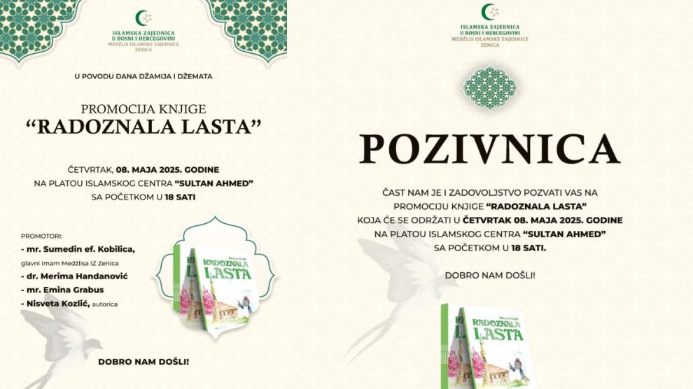 U okviru obilježavanja Dana džamija i džemata, Medžlis Islamske zajednice Zenica organizira promociju knjige „Radoznala lasta“ autorice Nisvete Kozlić. Ovaj kulturni događaj bit će održan u četvrtak, 8. maja 2025. godine, na platou Islamskog centra “Sultan Ahmed” s početkom u...