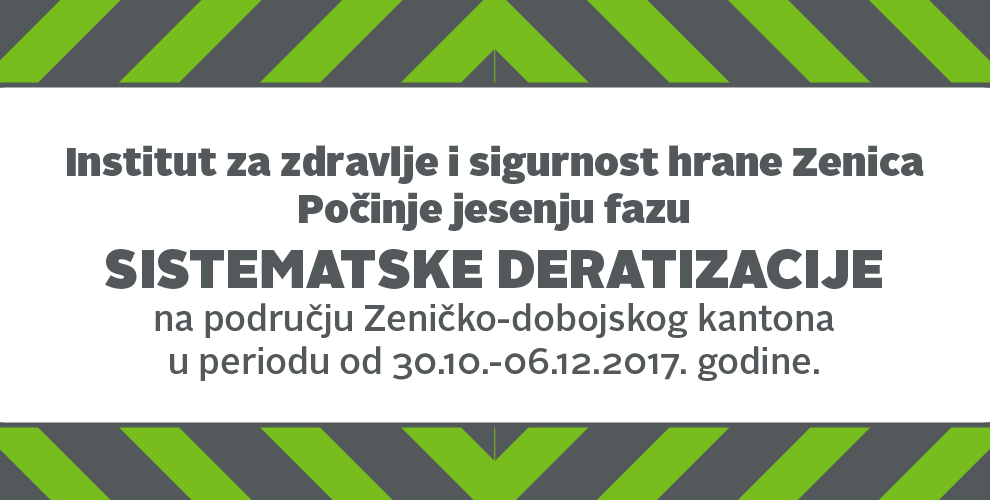 Počinje jesenja faza preventivne sistemske deratizacije u ZDK U ponedjeljak, 30. oktobra počinje jesenja faza preventivne sistematske deratizacije na području Zeničko-dobojskog kantona. Deratizaciju, prema Naredbi Kantonalnog Ministarstva zdravstva na području ovog kantona, po utvrđenom...