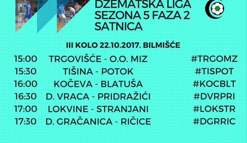 Najava trećeg, završnog kola 2. faze Džematske lige – U nedjelju 22.10.2017.godine na rasporedu je treće, završno kolo, 2.faze takmičenja u džematskoj ligi. Utakmice se igraju u dvorani Bilmišće od 15 do 18 sati. Glasanje za derbi ovog kola je do petka do 18:00 sati i to na...