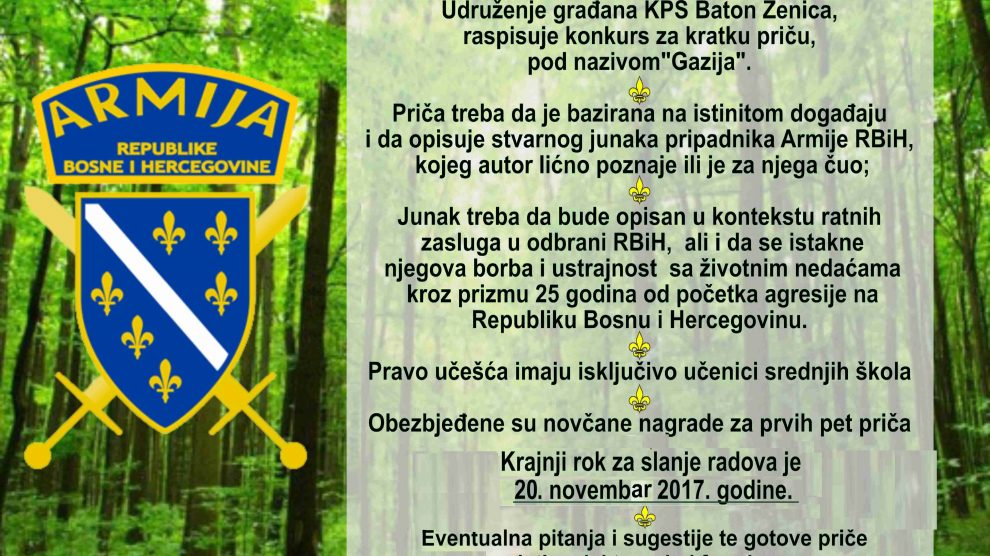 Konkurs za kratku priču, pod nazivom „Gazija“- Produžen rok do 20. novembra 2017. – Kao što je poznato Udruženje građana KPS Baton Zenica u skladu sa statutom Udruženja i afirmacije historijskih vrijednosti Bosne i Hercegovine, te obilježavanja godišnjice Trećeg korpusa Armije RBiH...