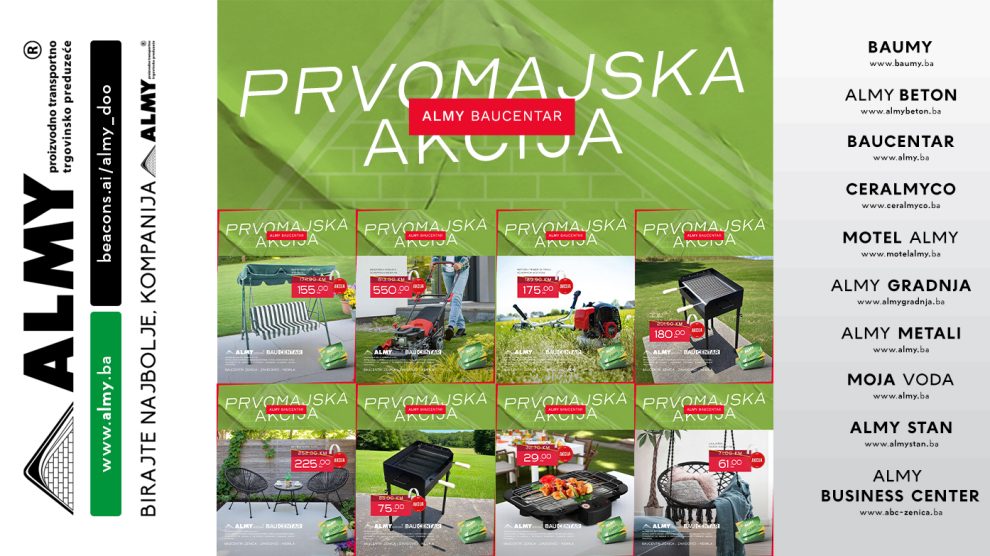 Prvomajska akcija u Almy Baucentrima: Veliki popusti na roštilje, baštenski namještaj i opremu!- PRVOMAJSKA AKCIJA U ALMY BAUCENTRIMA Sada je pravo vrijeme da se opremite vrhunskim roštiljima, baštenskim setovima, ljuljaškama, kosilicama i ostalim proizvodima po značajno sniženim cijenama...
