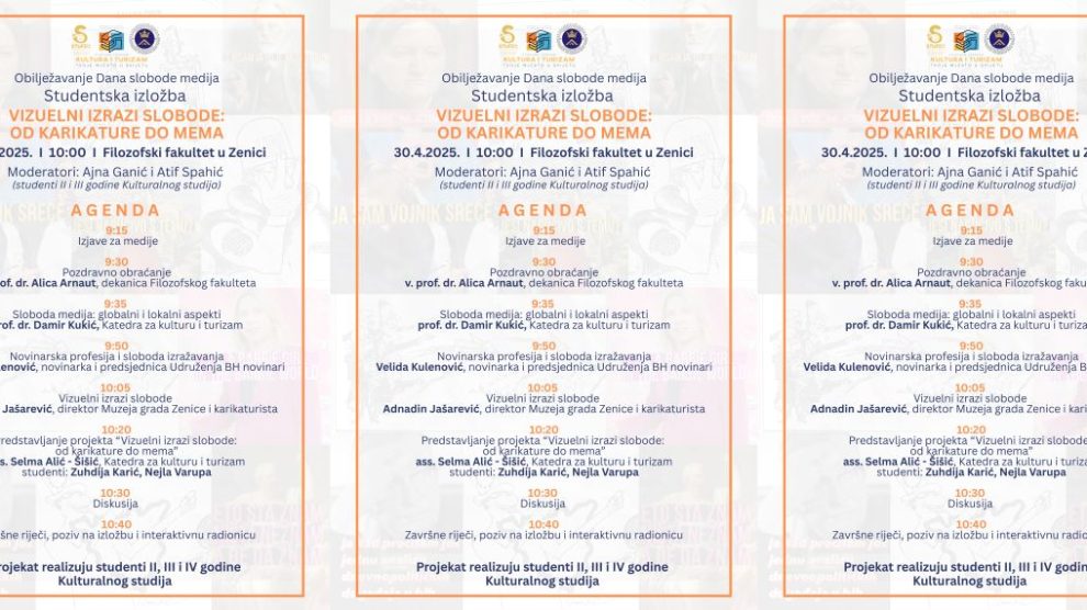 U organizaciji Katedre za kulturu i turizam Filozofskog fakulteta Univerziteta u Zenici, 30. aprila 2025. godine bit će obilježen Svjetski dan slobode medija kroz interdisciplinarni program koji uključuje predavanje na temu slobode medija (3. maj), studentsku izložbu pod nazivom „Vizuelni...
