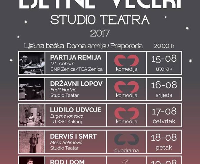 Festival “Ljetne večeri Studio Teatra” od 15. do 19. augusta – Udruženje za promociju i razvoj kulturnih aktivnosti “Studio teatar” iz Zenice, objavilo je i službeni program prvog netakmičarskog festivala “Ljetne večeri Studio Teatra” koji će se održati od 15. do 19. avgusta u...