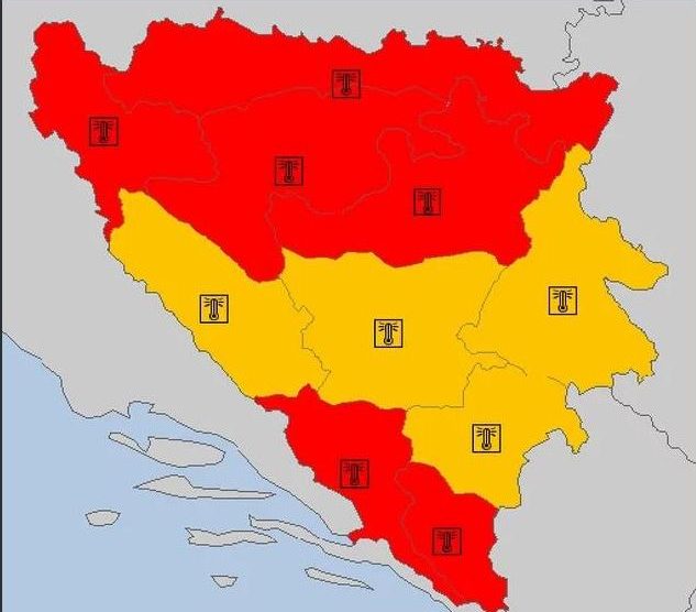 Crveno upozorenje za veći dio BiH zbog ekstremno visokih temperatura – Zbog ekstremno visokih dnevnih temperatura zraka za veći dio Bosne i Hercegovine izdato je crveno upozorenje Meteoalarma. Područje naše države našlo se pod utjecajem toplih zračnih masa koje pristižu sa sjevera...