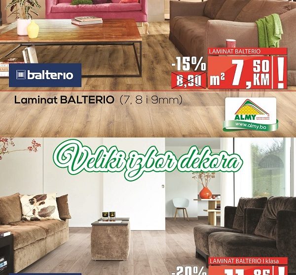 Almy bau centar: velika proljetna akcija laminata Balterio – U toku je velika proljetna akcija laminata Balterio u našem bau centru u Zenici sa sniženjima i do 20%. Iz ponude izdvajamo laminate 7, 8 i 9 mm te laminate I klase 32 i 33 uz veliki izbor dekora. Posjetite nas i uvjerite...
