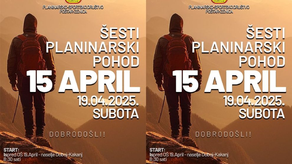 Planinarsko sportsko društvo „Poštar“ Zenica organizuje šesti po redu tradicionalni planinarski pohod pod nazivom „15. april“, koji će biti održan u subotu, 19. aprila 2025. godine. Okupljanje učesnika planirano je ispred Osnovne škole „15. april“ u naselju Doboj-Kakanj s početkom u 08:00...