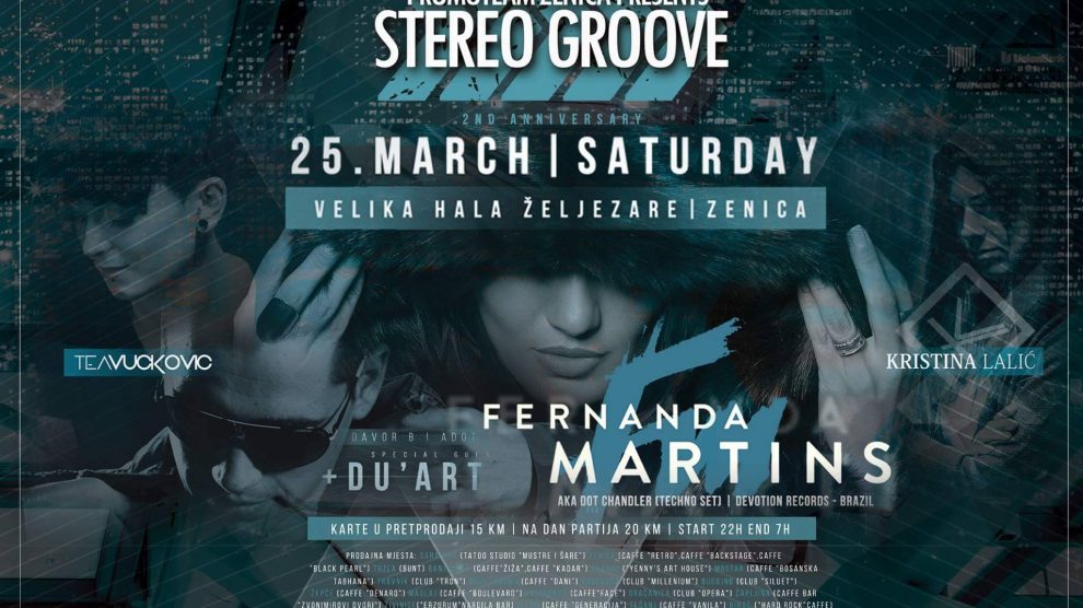StereoGroove 2nd Anniversary – 25.3. Željezara Zenica 25.03.2017 >>>VELIKA HALA ŽELJEZARE<<< LINK ZA EVENT Line-up: >FERNANDA MARTINS< (aka Dot Chandler)– Techno Set (Devotion Records/ Cubbo – Brasil) www.twitter.com/DjFerMartins | www.mixcloud...
