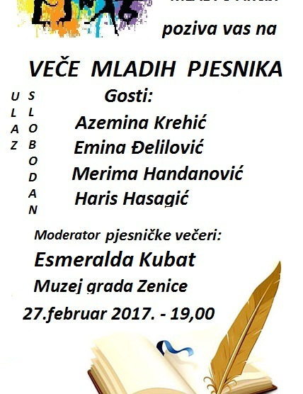 Veče Mladih Pjesnika – Muzej grada Zenice – 27.2. u 19 sati – Poštovani, Udruženje “Mladi u Akciji” Vas poziva da prisustvujete “Večeri Mladih Pjesnika” koja će se održati 27.02.2017.godine., u 19:00 h u Muzeju grada Zenice. “Veče Mladih...