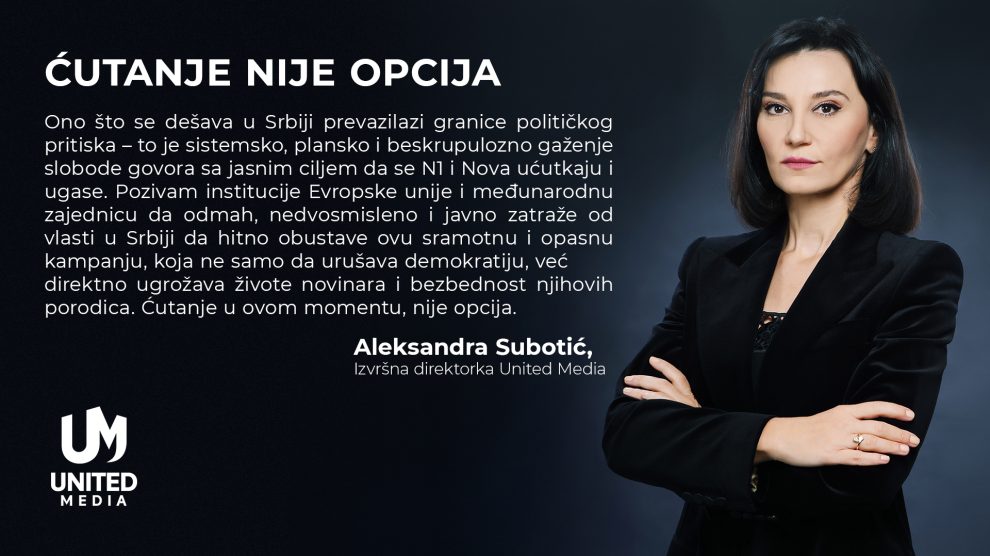 United Media, kompanija u okviru koje posluju televizije N1 i Nova, najoštrije osuđuje sve intenzivnije napade državnog vrha i provladinih tabloida na naše medije, koji su posljednjih dana dostigli opasnu tačku. U vremenu kada se istina o brutalnom policijskom nasilju nad demonstrantima...