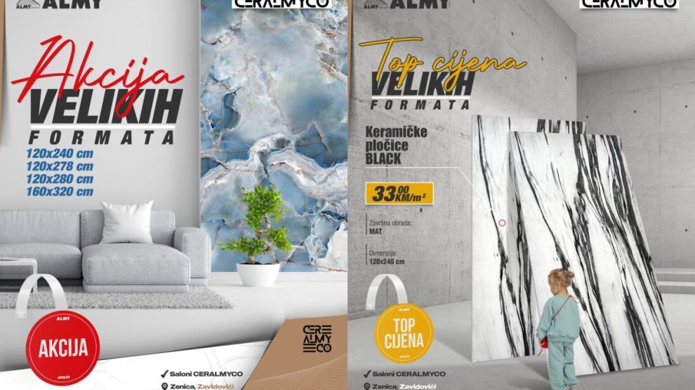 Saloni CERALMYCO – Zenica i Zavidovići AKCIJA VELIKIH FORMATA! AKCIJA VELIKIH formata keramičkih pločica u salonima CERALMYCO! Izdvajamo kremiku sljedećih dimenzija: – 120×240 cm – 120×278 cm – 120×280 cm – 160×320 cm Salon CERALMYCO...