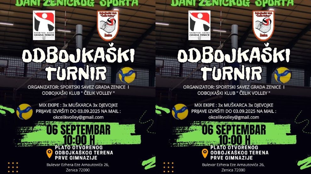 U sklopu manifestacije Dani zeničkog sporta, Sportski savez Grada Zenica i Odbojkaški klub Čelik-Volley Zenica organizuju mješoviti odbojkaški turnir na otvorenom, koji će se održati na terenu Prve gimnazije u Zenici. Turnir je zakazan za subotu, 6. septembar 2025. godine, s početkom u...
