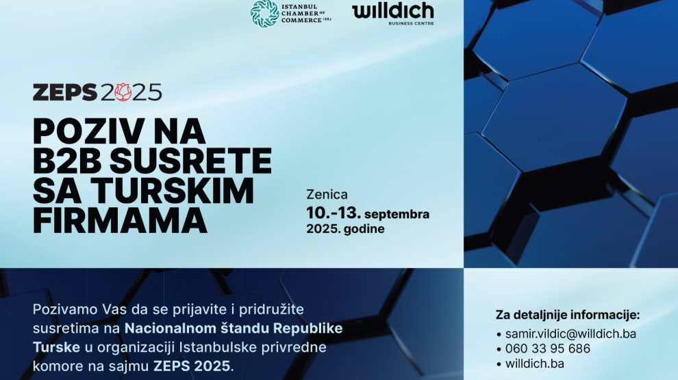 U ime Istanbulske privredne komore i WILLDICH Business Centra pozivamo naše privrednike i poduzetnike da prisustvuju susretima na Nacionalnom štandu Republike Turske na prestižnom sajmu ZEPS 2025, koji će se održati u Zenici od 10. do 13. septembra 2025. godine. Sajam ZEPS pruža...