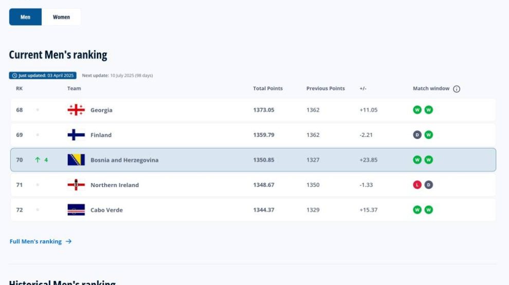 Na najnovijoj FIFA-inoj rang listi najboljih svjetskih reprezentacija, selekcija Bosne i Hercegovine napredovala je četiri pozicije i zauzima 70. mjesto sa 1.350 bodova. Naša selekcija osvojila je najviše bodova u martovskom “prozoru” bodovanja od svih reprezentacija (24.16)...