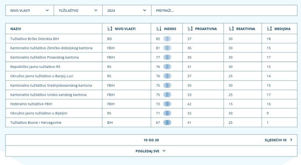 Transparency international u BiH u saradnji sa Balkanskom istraživačkom mrežnom BIRN izradila je i predstavila Indeks transparentnosti pravosuđa za 2024. godinu. Indeks transparentnosti pravosuđa rezultat je istraživanja na osnovu odgovora pravosudnih institucija, te podataka koje...