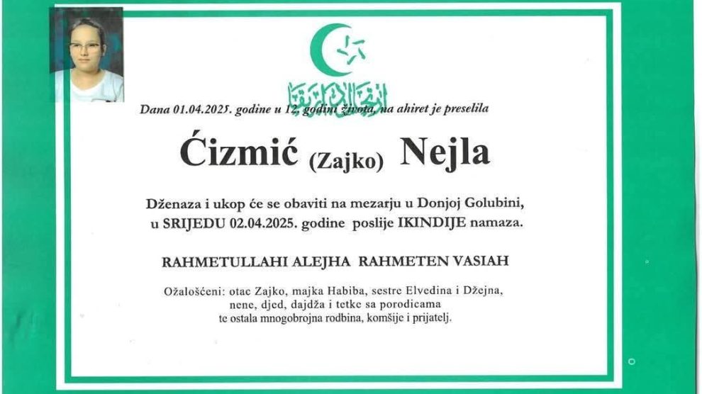 Preminula djevojčica Nejla Čizmić nakon dugogodišnje borbe s bolestima- Nejla Čizmić, djevojčica iz Žepča čija je životna borba inspirisala mnoge, preminula je nakon dugogodišnje bitke sa teškim zdravstvenim problemima. Nejla je od rođenja vodila bitku s rijetkim dijagnozama – spina...