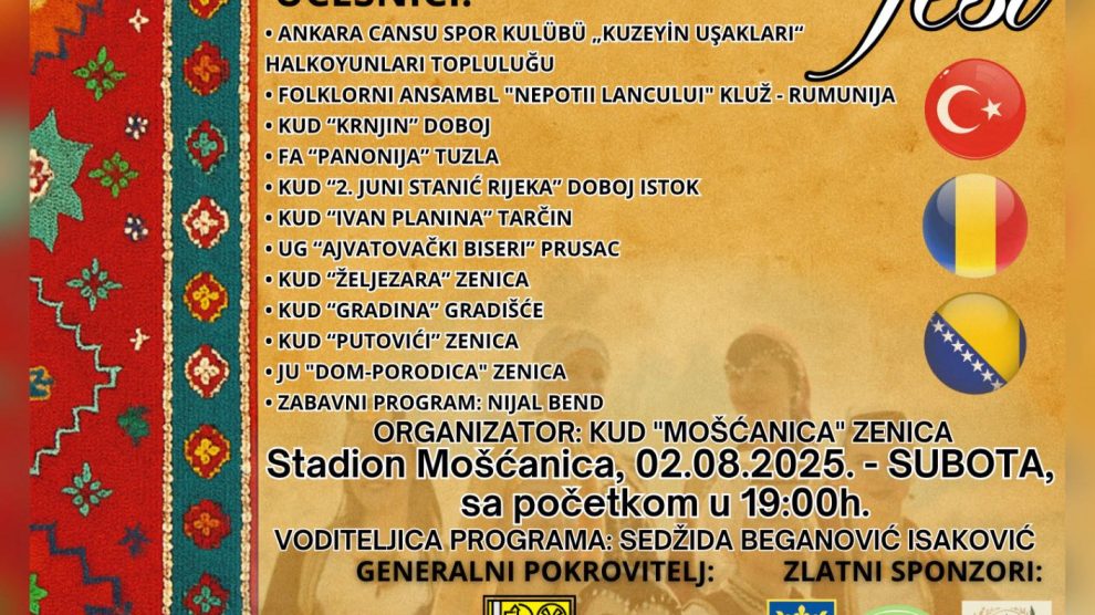 XI MEĐUNARODNI FESTIVAL FOLKLORNOG STVARALAŠTVA „MOŠĆANICA FEST 2025.“ Stadion Mošćanica, Zenica Subota, 02. august 2025. godine u 19:00 sati Kulturno-umjetničko društvo „Mošćanica“ Zenica sa ponosom najavljuje jedanaesto izdanje Međunarodnog festivala folklornog stvaralaštva „Mošćanica...