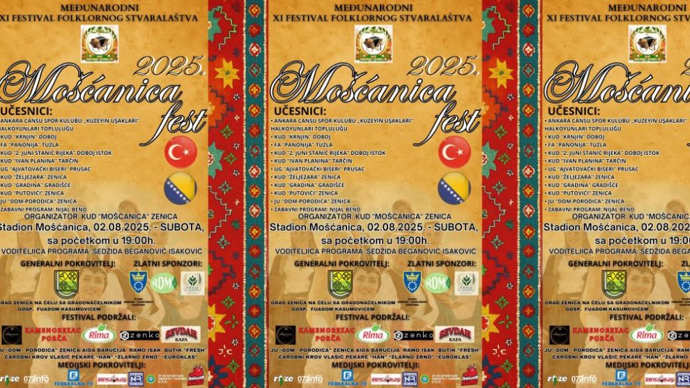 NAJAVA: XI međunarodni festival folklornog stvaralaštva „Mošćanica fest 2025.“- XI MEĐUNARODNI FESTIVAL FOLKLORNOG STVARALAŠTVA „MOŠĆANICA FEST 2025.“ Stadion Mošćanica, Zenica Subota, 02. august 2025. godine u 19:00 sati Kulturno-umjetničko društvo „Mošćanica“ Zenica sa ponosom...