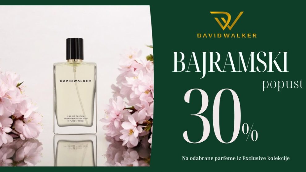 Povodom nadolazećeg Bajrama, parfimerije David Walker pripremile su posebnu pogodnost za sve ljubitelje luksuznih mirisa. U razdoblju od 28. do 30. ožujka, kupci će moći iskoristiti 30% popusta na odabrane parfeme iz Exclusive kolekcije (50 ml). Ova ponuda dostupna je u svim David Walker...