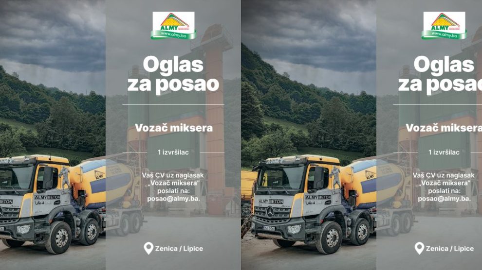 Oglas za posao: Vozač miksera- Almy d.o.o. Zenica objavljuje konkurs za prijem u radni odnos: Pozicija: Vozač miksera; Lokacija: Zenica / Lipice; Broj izvršilaca: 1. USLOVI: – SSS; – KV Vozač; – Poželjno posjedovanje digitalne kartice; – Spremnost na rad u timu...