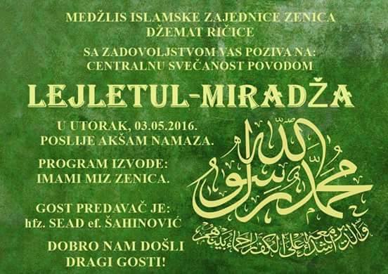 Centralna svečanost u džematu Ričice – Već smo objavili da muslimani su utorak 03.maja obilježavaju Lejletu-l-Mi’radž ili Noć uzdignuća Muhammeda a.s. u najviše nebeske sfere, koje se desilo 27. Redžeba, ali nas podsjeća i na dolazak predstojećeg mubarek mjeseca Ramazana. Tim...