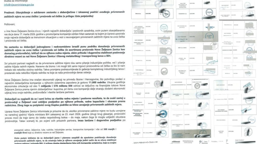 Nakon višesedmične neizvjesnosti oko privremenih zaštitnih mjera na uvoz čelika, desetine velikih dobavljača Nove Željezare Zenica potpisali su zajednički dokument podrške i danas ga uputili Vijeću ministara BiH. Potpisnici poručuju: očuvanje domaće proizvodnje čelika ključ je stabilnosti...