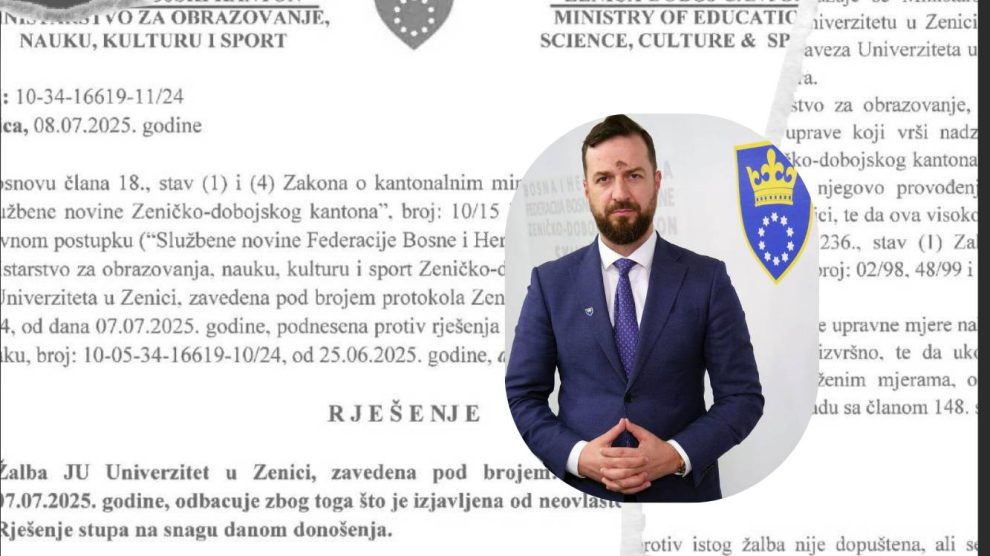 Ministarstvo za obrazovanje, nauku, kulturu i sport Zeničko-dobojskog kantona, rješavajući po žalbi JU Univerziteta u Zenici, (10-34-1661920/24, od dana 07.07.2025. godine), podnesenoj protiv rješenja kantonalnog inspektora za obrazovanje i nauku, (10-05-34-16619-10/24, od 25.06.2025...