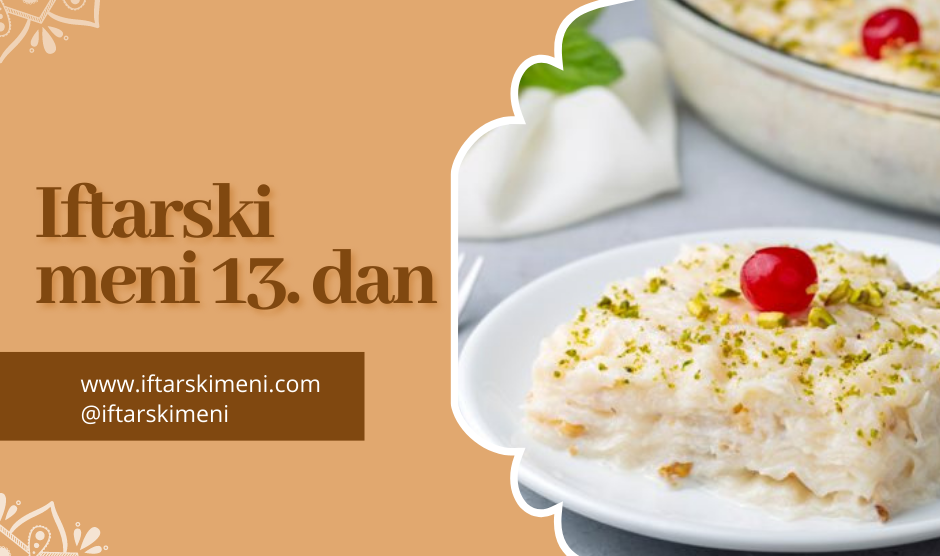 Prijedlozi i recepti za iftarski meni: Naši prijatelji sa web stranice Iftarski meni napravili su za cijeli mjesec ramazan prijedloge i recepte za svaki dan. PREDJELA Pamuk čorba Povrtna supa Domaća supa od povrća sa pilećom jetricom GLAVNA JELA Piletina u sosu od karija Adana kebab sa...