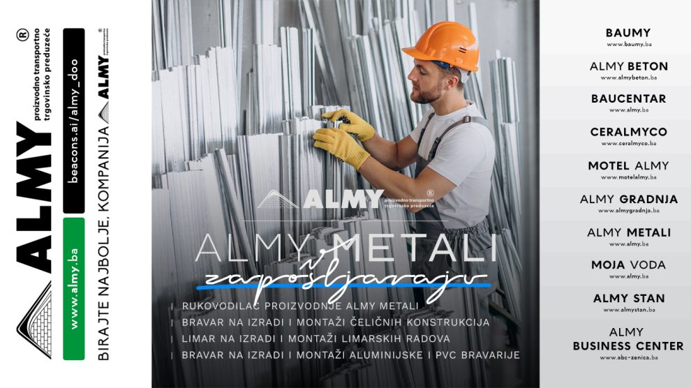 Almy Metali Zavidovići zapošljavaju: Potrebni limari, bravari i rukovodilac proizvodnje- Kompanija Almy Metali Zavidovići širi svoj tim i otvara konkurse za sljedeće radne pozicije: | Rukovodilac proizvodnje Almy Metali – 1 izvršilac; | Bravar na izradi i montaži čeličnih konstrukcija – 3...