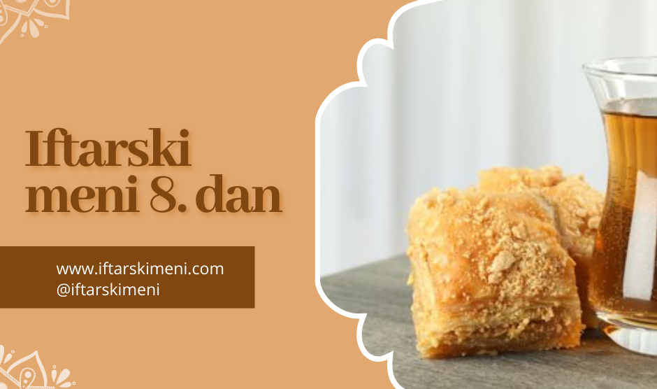 PRIJEDLOZI I RECEPTI ZA OSMI DAN RAMAZANA PREDJELA Krem supa od pečene paprike i paradajza Krem supa od šampinjona Supa od bamije GLAVNA JELA Teleći medaljoni sa gljivama Makluba (Arapska makluba) Đuveč sa miješanim mesom DESERTI Limun cheesecake Cheesecake sa breskvama iz konzerve Buhtle...
