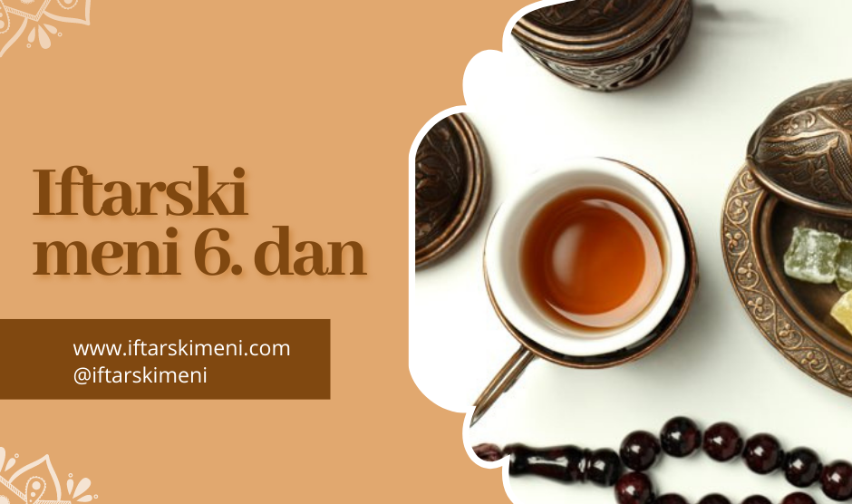 Prijedlozi i recepti za iftarski meni: Naši prijatelji sa web stranice Iftarski meni napravili su za cijeli mjesec ramazan prijedloge i recepte za svaki dan. Iftarski meni za peti dan ramazana: PREDJELA Supa od brokule Merdžimek čorba Čorba sa junetinom GLAVNA JELA Pohovane palačinke...