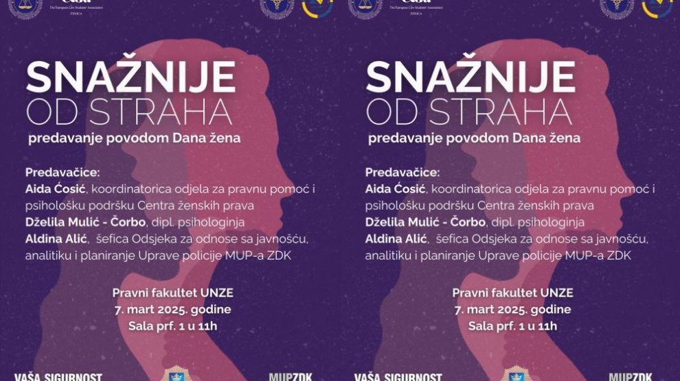 NAJAVA: Predavanje povodom Dana žena “Snažnije od straha”- Povodom Dana žena, 7. marta 2025. godine na Pravnom fakultetu Univerziteta u Zenici planirano je predavanje “Snažnije od straha”. Kako navode organizatori ovog događaja, tokom susreta planirano je da se...