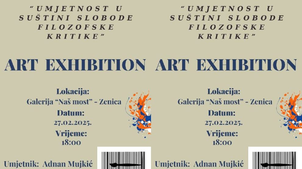 Udruženje Naš most sa zadovoljstvom najavljuje otvaranje treće samostalne izložbe mladog bh. umjetnika Adnana Mujkića, pod naslovom „Umjetnost u suštini slobode filozofske kritike“. Otvaranje izložbe zakazano je za 27. februar 2025. godine, s početkom u 18:00 h, u prostorijama Udruženja...