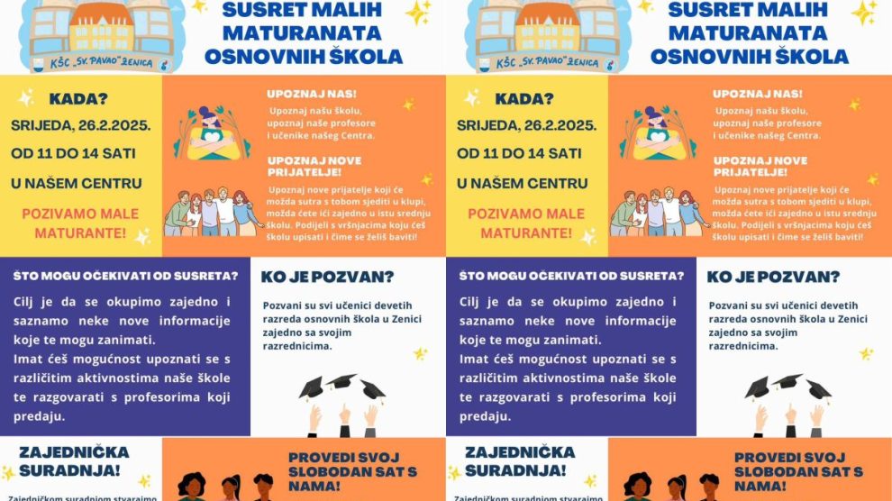 Dana 26. februara 2025. godine, od 11 do 14 sati, u KŠC “Sv. Pavao” Zenica održat će se poseban susret namijenjen svim učenicima devetih razreda osnovnih škola u Zenici. Ovo je jedinstvena prilika da se upoznate s našom školom, njezinim profesorima i učenicima, ali i da steknete nove...