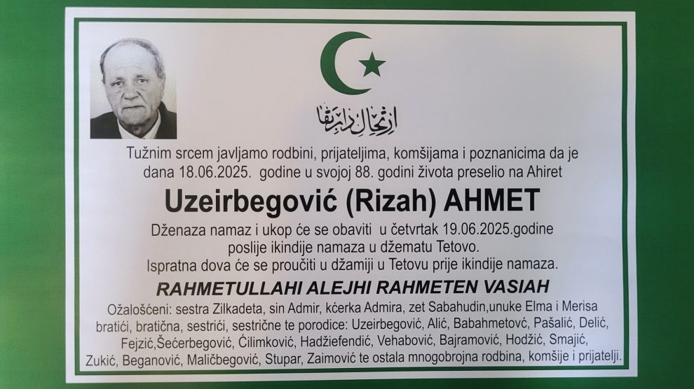 Moj komšija, Ahmet Uzeirbegović, preselio je u 88. godini života. Iako su godine neumitne, njegov odlazak teško pada – jer nije otišao samo jedan čovjek, nego čitav svijet s njim. Ahmet nije bio poznat široj javnosti, nije se pojavljivao po televizijama, nije držao govore, ali je bio neko...