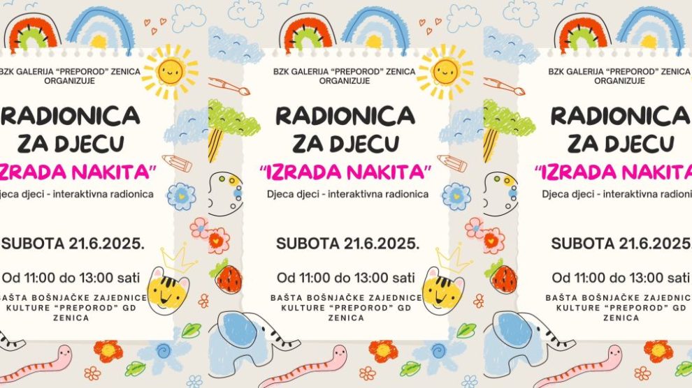 BZK Galerija“ Preporod“ Zenica u okviru dugogodišnje saradnje sa BZK“Preporod“ Dubrovnik ( Hrvatska) realizovat će Radionicu za djecu „Izrada nakita“. Članovi BZK “Preporod“ Dubrovnik dolaze u posjetu Galeriji „Preporod“ Zenica i boravit će u Zenici od 20.6.2025. godine do 22.6.2025...